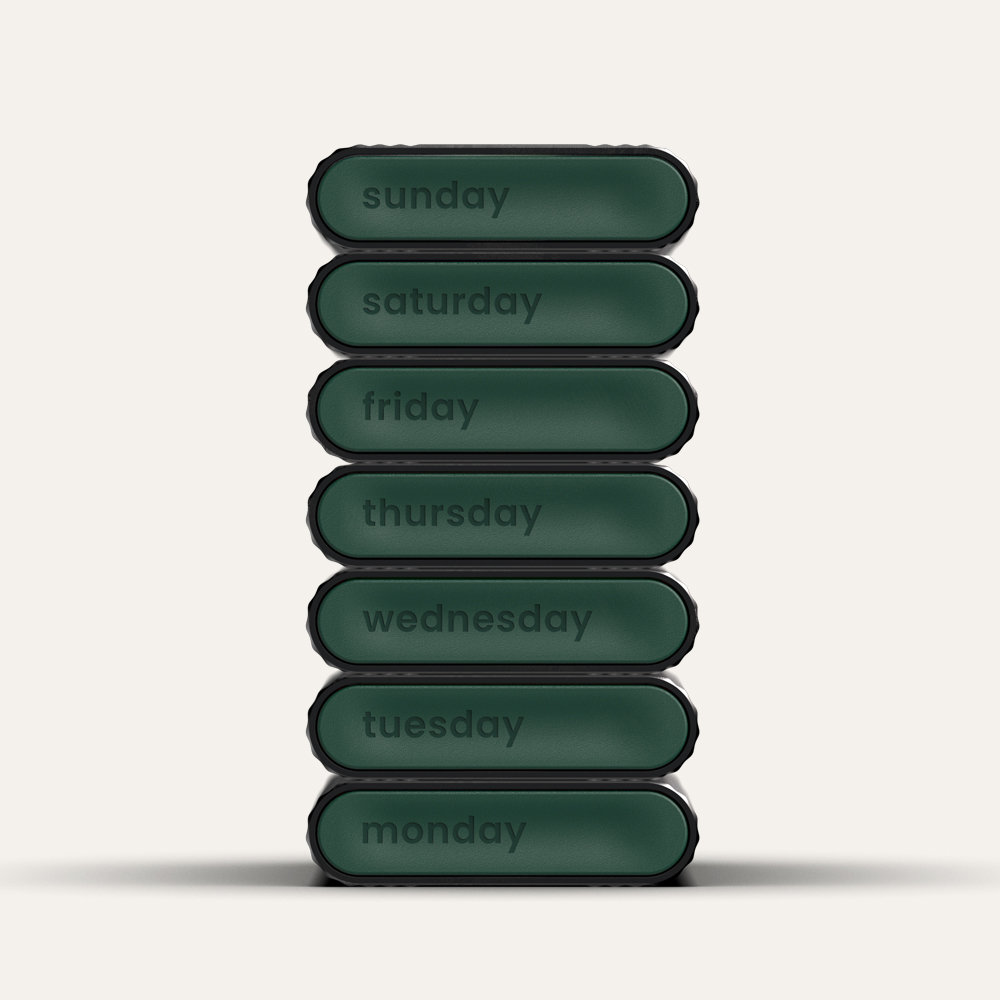 Die Wochentage sind klar und dezent auf dem Case gekennzeichnet und helfen dabei, den Überblick zu behalten. Die Fächer sind leicht zu öffnen und schließen sicher, damit alles dort bleibt, wo es hingehört.